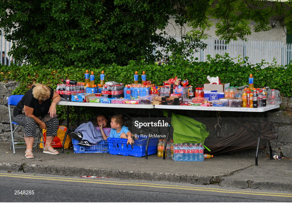 24 June 2023; A street trador checks in on two children taking shelter under her stall before the GAA Hurling All-Ireland Senior Championship Quarter Final match between Clare and Dublin at TUS Gaelic Grounds in Limerick. Photo by Ray McManus/Sportsfile