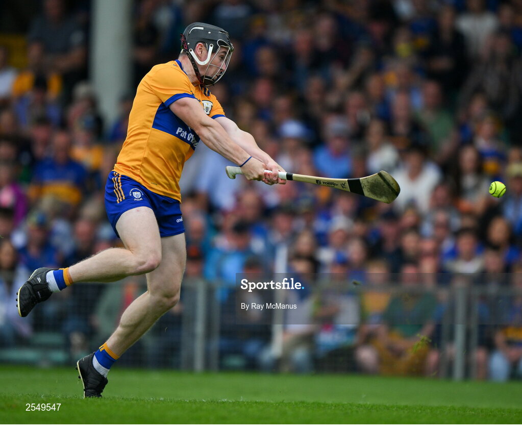 24 June 2023; Tony Kelly of Clare shoots his side's 5th goal, in the 38th minute, during the GAA Hurling All-Ireland Senior Championship Quarter Final match between Clare and Dublin at TUS Gaelic Grounds in Limerick. Photo by Ray McManus/Sportsfile