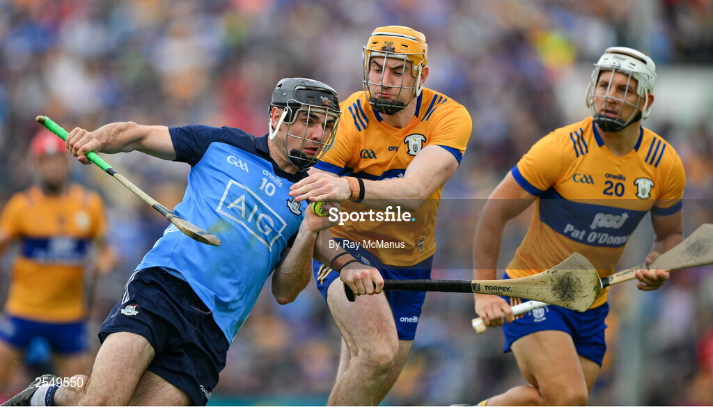 24 June 2023; Danny Sutcliffe of Dublin is tackled by David Fitzgerald and Aron Shanagher of Clare, right, during the GAA Hurling All-Ireland Senior Championship Quarter Final match between Clare and Dublin at TUS Gaelic Grounds in Limerick. Photo by Ray McManus/Sportsfile