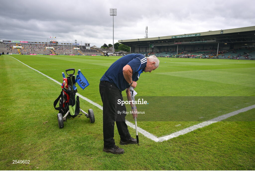 24 June 2023; A member of the grounds staff places flags around the ground before the GAA Hurling All-Ireland Senior Championship Quarter Final match between Clare and Dublin at TUS Gaelic Grounds in Limerick. Photo by Ray McManus/Sportsfile