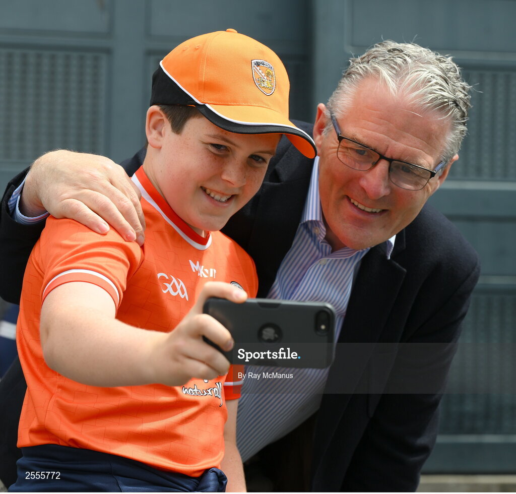 1 July 2023; Twelve year old Armagh supporter Niall Doherty, from Mullaghbawn, takes a selfie with Uachtarán Tofa Chumann Lúthchleas Gael Jarlath Burns before the GAA Football All-Ireland Senior Championship quarter-final match between Armagh and Monaghan at Croke Park in Dublin. Photo by Ray McManus/Sportsfile