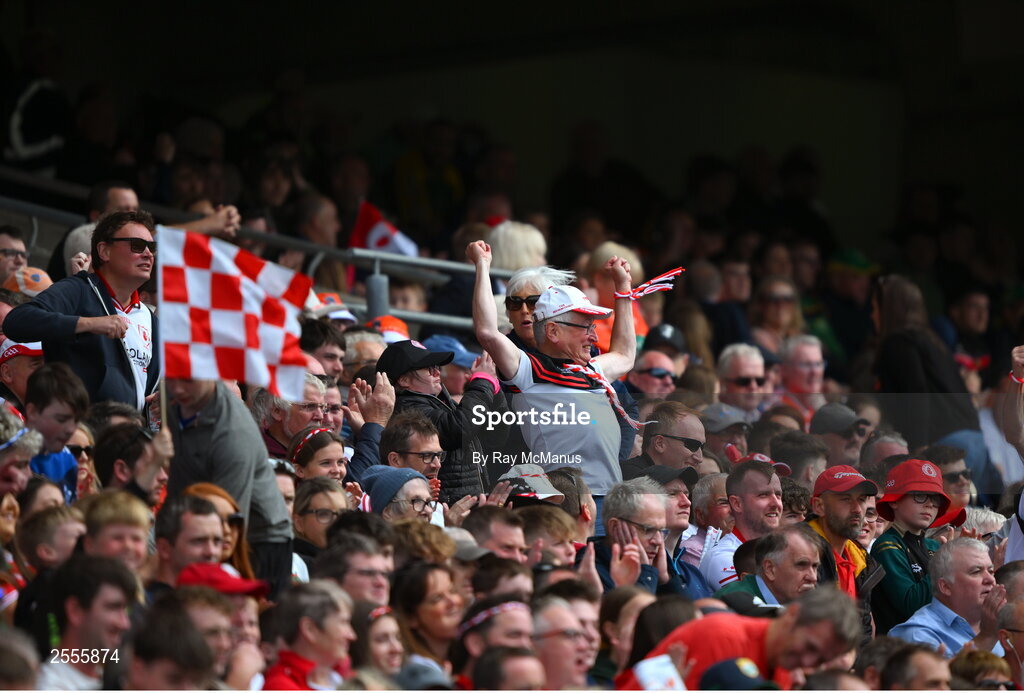 1 July 2023; Tyrone supporters, in the Cusack Stand, celebrate a first half score during the GAA Football All-Ireland Senior Championship quarter-final match between Kerry and Tyrone at Croke Park in Dublin. Photo by Ray McManus/Sportsfile