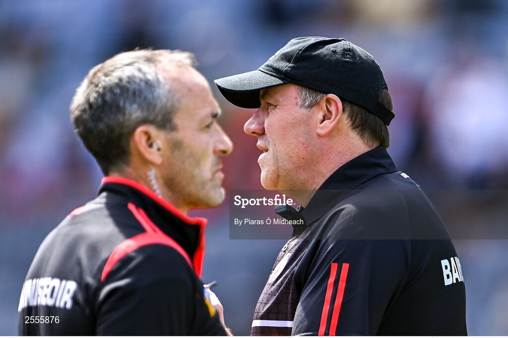 1 July 2023; Tyrone joint-managers Brian Dooher, left, and Feargal Logan before the GAA Football All-Ireland Senior Championship quarter-final match between Kerry and Tyrone at Croke Park in Dublin. Photo by Piaras Ó Mídheach/Sportsfile