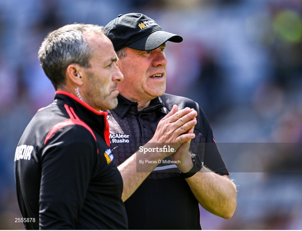 1 July 2023; Tyrone joint-managers Brian Dooher, left, and Feargal Logan before the GAA Football All-Ireland Senior Championship quarter-final match between Kerry and Tyrone at Croke Park in Dublin. Photo by Piaras Ó Mídheach/Sportsfile