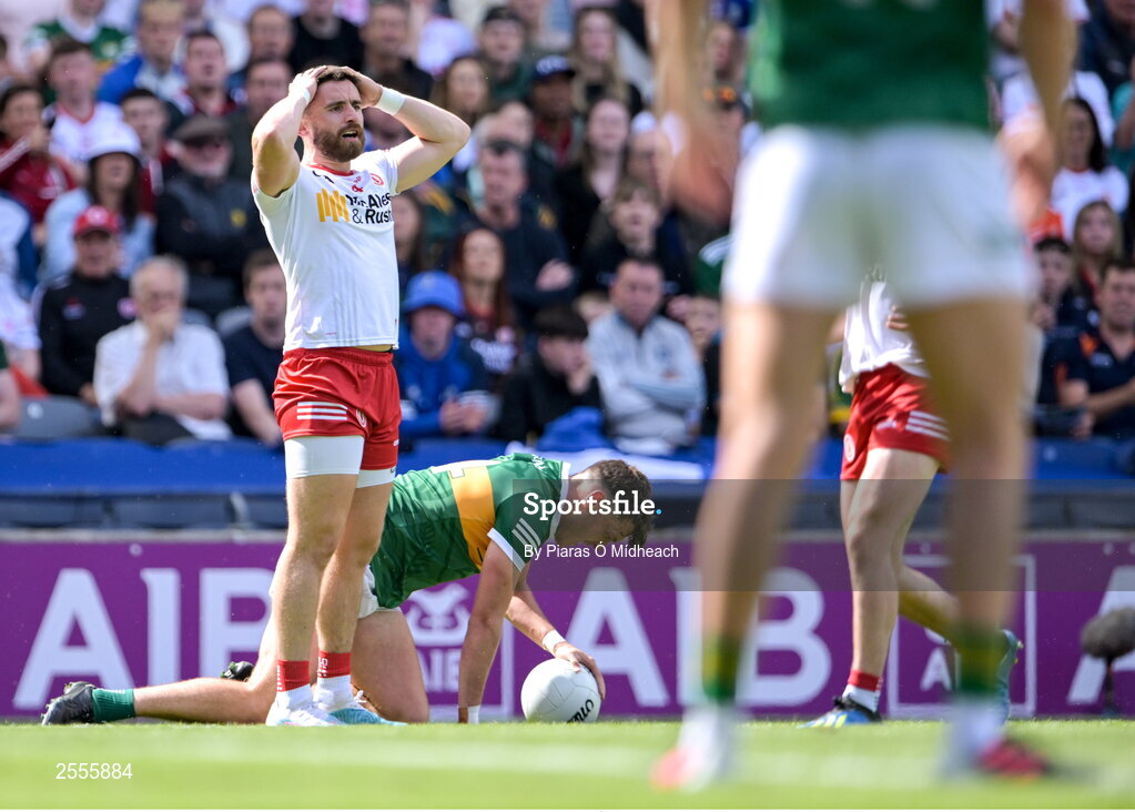 1 July 2023; Pádraig Hampsey of Tyrone after Kerry were awarded a free during the GAA Football All-Ireland Senior Championship quarter-final match between Kerry and Tyrone at Croke Park in Dublin. Photo by Piaras Ó Mídheach/Sportsfile