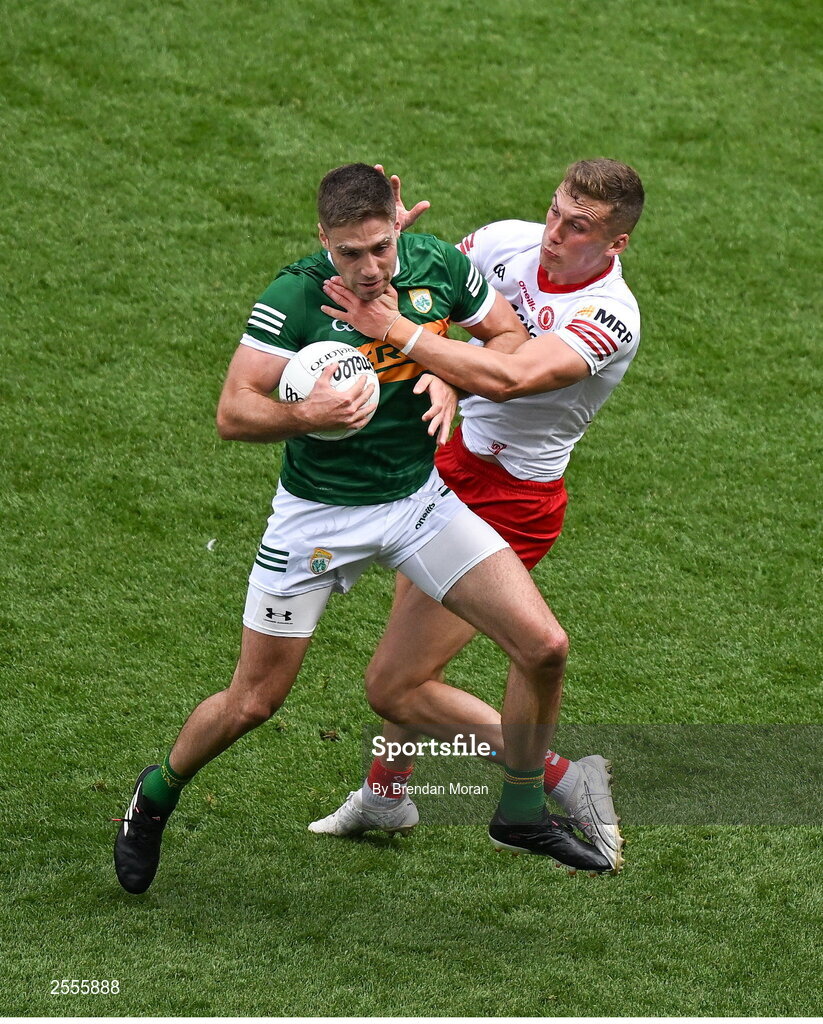 1 July 2023; Adrian Spillane of Kerry is tackled by Conn Kilpatrick of Tyrone during the GAA Football All-Ireland Senior Championship quarter-final match between Kerry and Tyrone at Croke Park in Dublin. Photo by Brendan Moran/Sportsfile