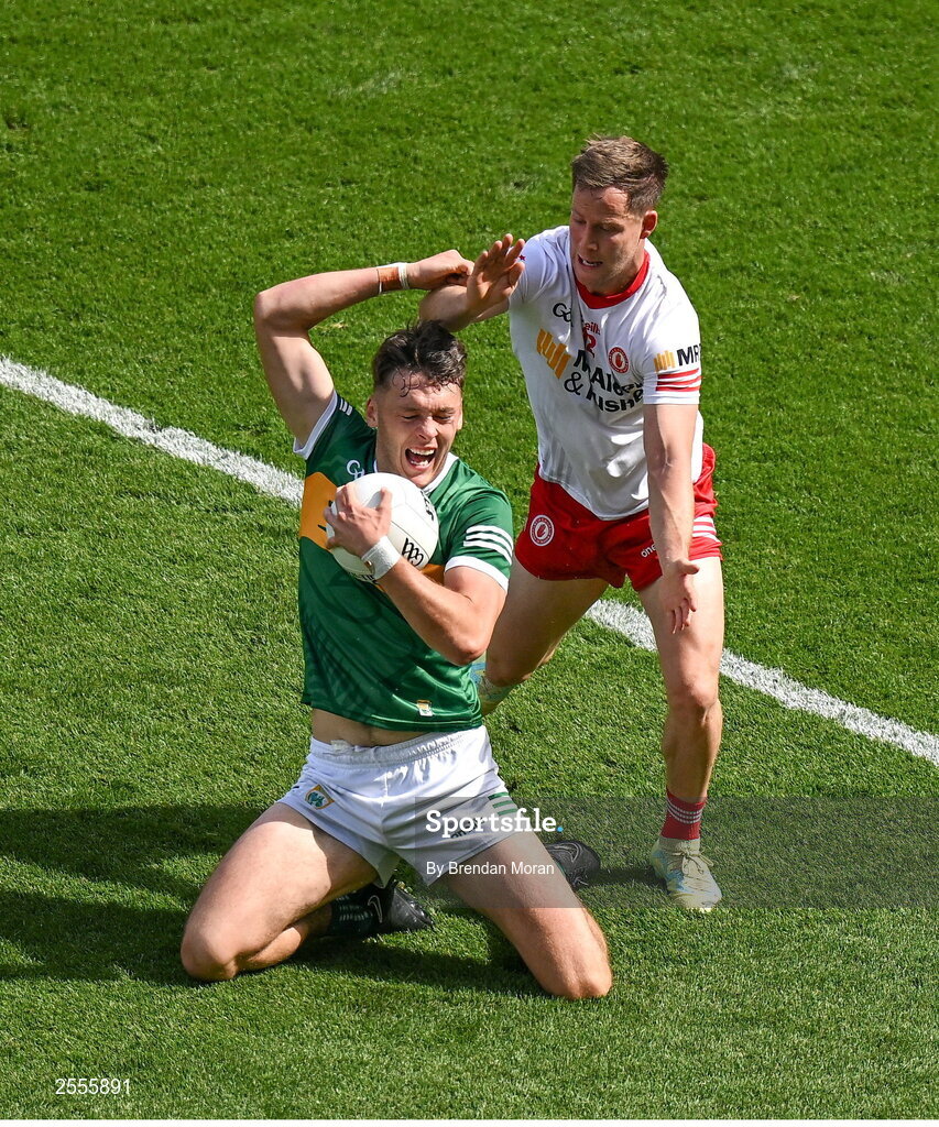 1 July 2023; David Clifford of Kerry is tackled by Kieran McGeary of Tyrone during the GAA Football All-Ireland Senior Championship quarter-final match between Kerry and Tyrone at Croke Park in Dublin. Photo by Brendan Moran/Sportsfile