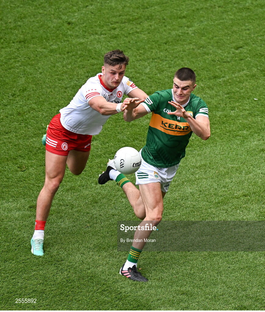 1 July 2023; Sean O'Shea of Kerry is tackled by Michael McKernan of Tyrone during the GAA Football All-Ireland Senior Championship quarter-final match between Kerry and Tyrone at Croke Park in Dublin. Photo by Brendan Moran/Sportsfile
