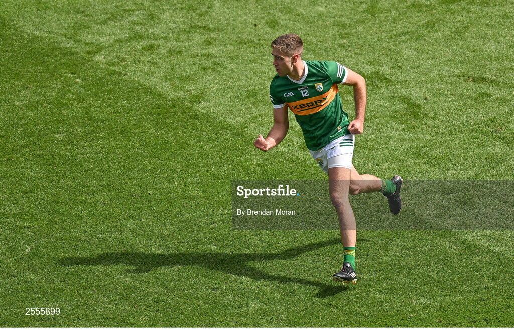 1 July 2023; Adrian Spillane of Kerry celebrates after kicking a point during the GAA Football All-Ireland Senior Championship quarter-final match between Kerry and Tyrone at Croke Park in Dublin. Photo by Brendan Moran/Sportsfile
