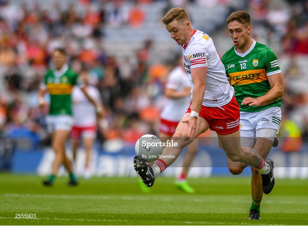 1 July 2023; Michael O’Neill of Tyrone in action against Adrian Spillane of Kerry during the GAA Football All-Ireland Senior Championship quarter-final match between Kerry and Tyrone at Croke Park in Dublin. Photo John Sheridan/Sportsfile