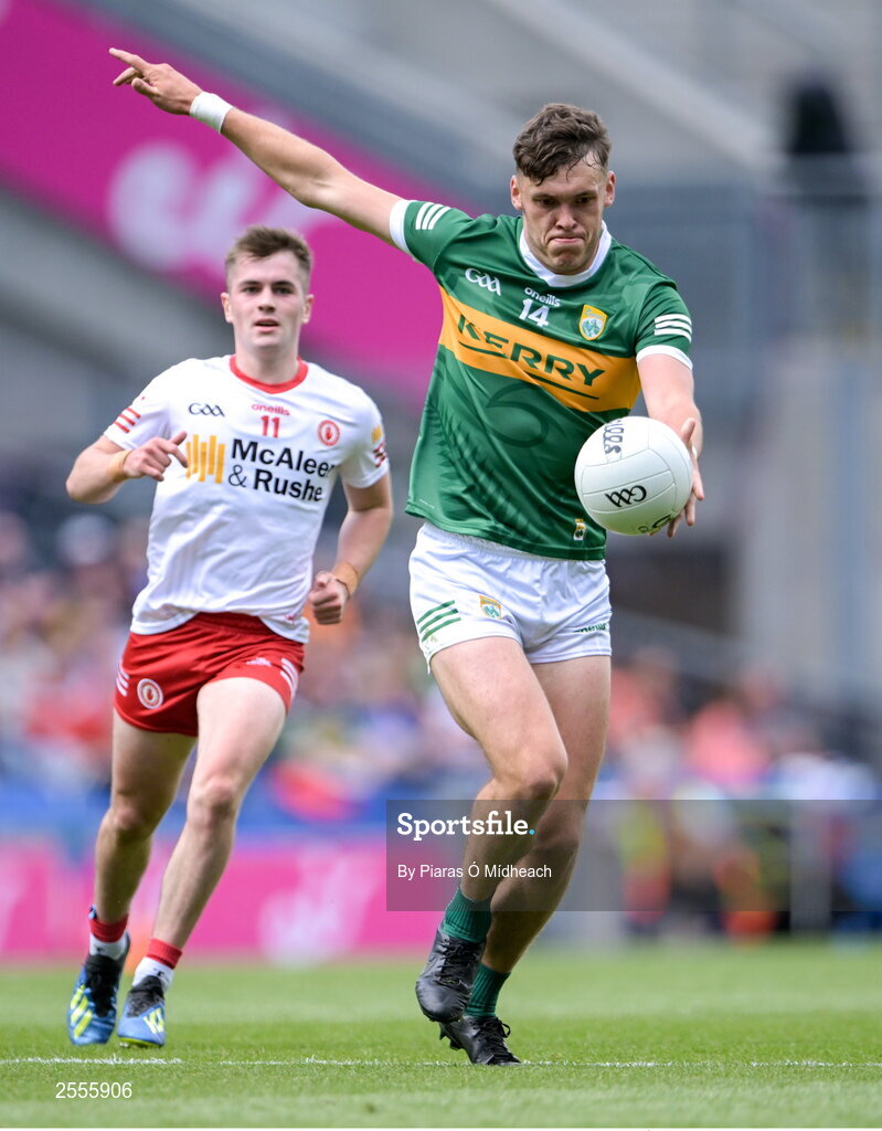 1 July 2023; David Clifford of Kerry as Ruairí Canavan of Tyrone looks on during the GAA Football All-Ireland Senior Championship quarter-final match between Kerry and Tyrone at Croke Park in Dublin. Photo by Piaras Ó Mídheach/Sportsfile