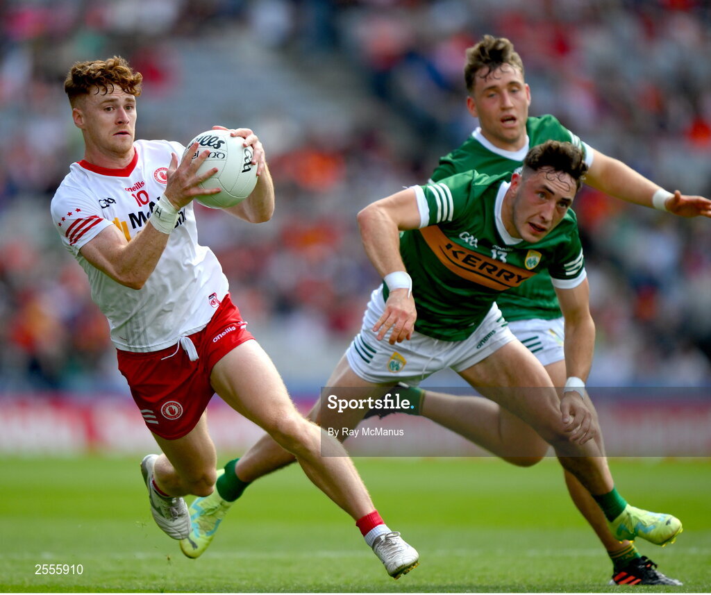 1 July 2023; Conor Meyler of Tyrone in action against Paudie Clifford and Dara Moynihan of Kerry during the GAA Football All-Ireland Senior Championship quarter-final match between Kerry and Tyrone at Croke Park in Dublin. Photo by Ray McManus/Sportsfile