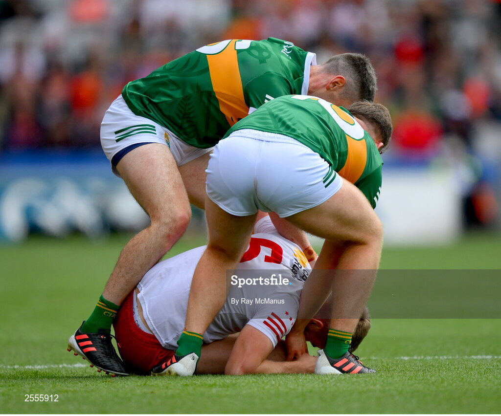 1 July 2023; Cormac Quinn of Tyrone in action against Dara Moynihan and Paul Geaney of Kerry during the GAA Football All-Ireland Senior Championship quarter-final match between Kerry and Tyrone at Croke Park in Dublin. Photo by Ray McManus/Sportsfile