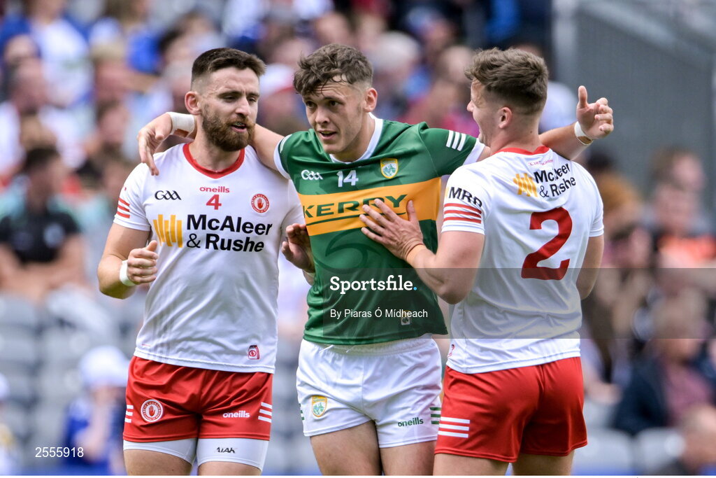 1 July 2023; David Clifford of Kerry shares a joke with Tyrone players Pádraig Hampsey, left, and Michael McKernan during the GAA Football All-Ireland Senior Championship quarter-final match between Kerry and Tyrone at Croke Park in Dublin. Photo by Piaras Ó Mídheach/Sportsfile