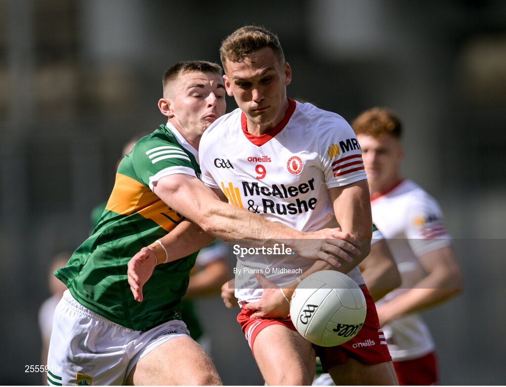 1 July 2023; Conn Kilpatrick of Tyrone in action against Diarmuid O'Connor of Kerry during the GAA Football All-Ireland Senior Championship quarter-final match between Kerry and Tyrone at Croke Park in Dublin. Photo by Piaras Ó Mídheach/Sportsfile