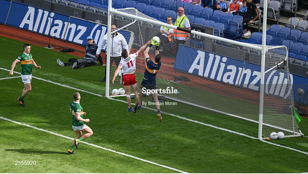 1 July 2023; Kerry goalkeeper Shane Ryan saves under pressure from Ruiari Canavan of Tyrone during the GAA Football All-Ireland Senior Championship quarter-final match between Kerry and Tyrone at Croke Park in Dublin. Photo by Brendan Moran/Sportsfile