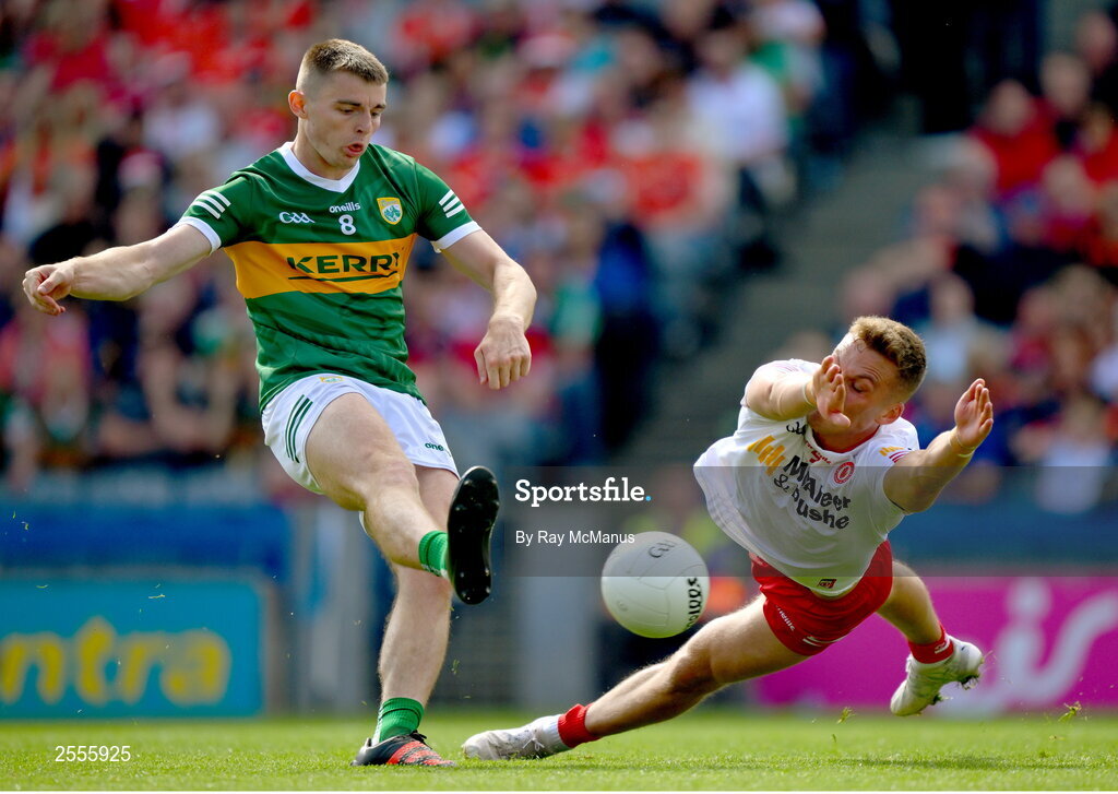 1 July 2023; Diarmuid O'Connor of Kerry shoots past Conn Kilpatrick of Tyrone to score a goal, in the 52nd minute, during the GAA Football All-Ireland Senior Championship quarter-final match between Kerry and Tyrone at Croke Park in Dublin. Photo by Ray McManus/Sportsfile