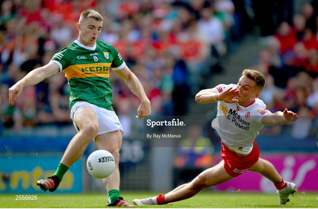 1 July 2023; Diarmuid O'Connor of Kerry shoots past Conn Kilpatrick of Tyrone to score a goal, in the 52nd minute, during the GAA Football All-Ireland Senior Championship quarter-final match between Kerry and Tyrone at Croke Park in Dublin. Photo by Ray McManus/Sportsfile