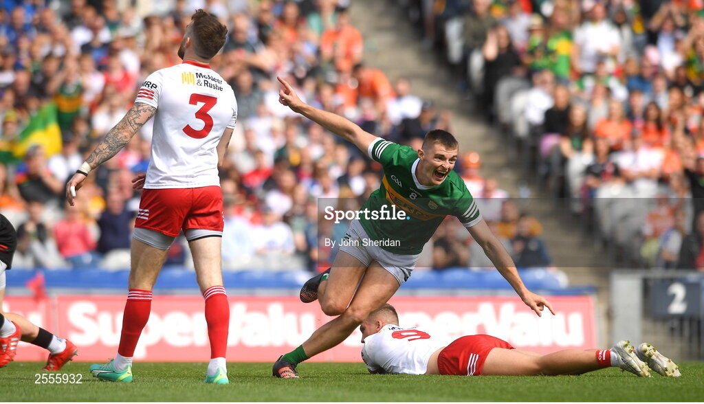 1 July 2023; Diarmuid O'Connor of Kerry celebrates after scoring his side's first goal during the GAA Football All-Ireland Senior Championship quarter-final match between Kerry and Tyrone at Croke Park in Dublin. Photo John Sheridan/Sportsfile