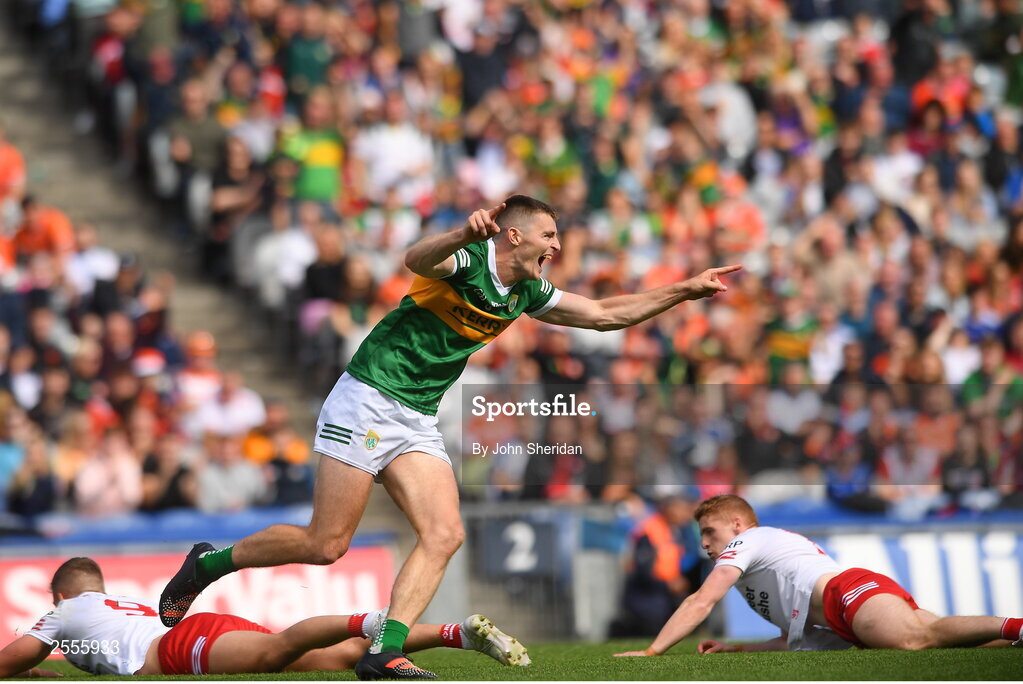 1 July 2023; Diarmuid O'Connor of Kerry celebrates after scoring his side's first goal during the GAA Football All-Ireland Senior Championship quarter-final match between Kerry and Tyrone at Croke Park in Dublin. Photo John Sheridan/Sportsfile