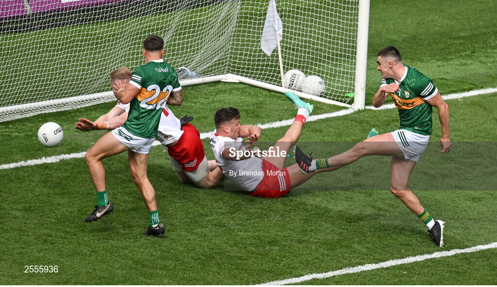 1 July 2023; Sean O'Shea of Kerry scores his side's second goal past Frank Burns and Michael McKernan during the GAA Football All-Ireland Senior Championship quarter-final match between Kerry and Tyrone at Croke Park in Dublin. Photo by Brendan Moran/Sportsfile