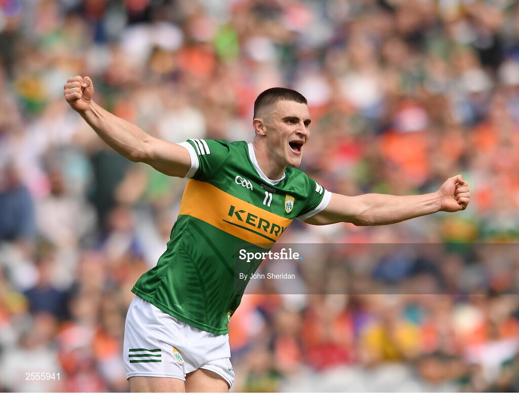1 July 2023; Sean O'Shea of Kerry celebrates after scoring his side's second goal during the GAA Football All-Ireland Senior Championship quarter-final match between Kerry and Tyrone at Croke Park in Dublin. Photo John Sheridan/Sportsfile