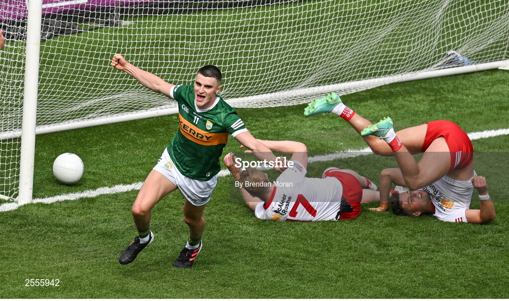 1 July 2023; Sean O'Shea of Kerry celebrates after scoring his side's second goal during the GAA Football All-Ireland Senior Championship quarter-final match between Kerry and Tyrone at Croke Park in Dublin. Photo by Brendan Moran/Sportsfile