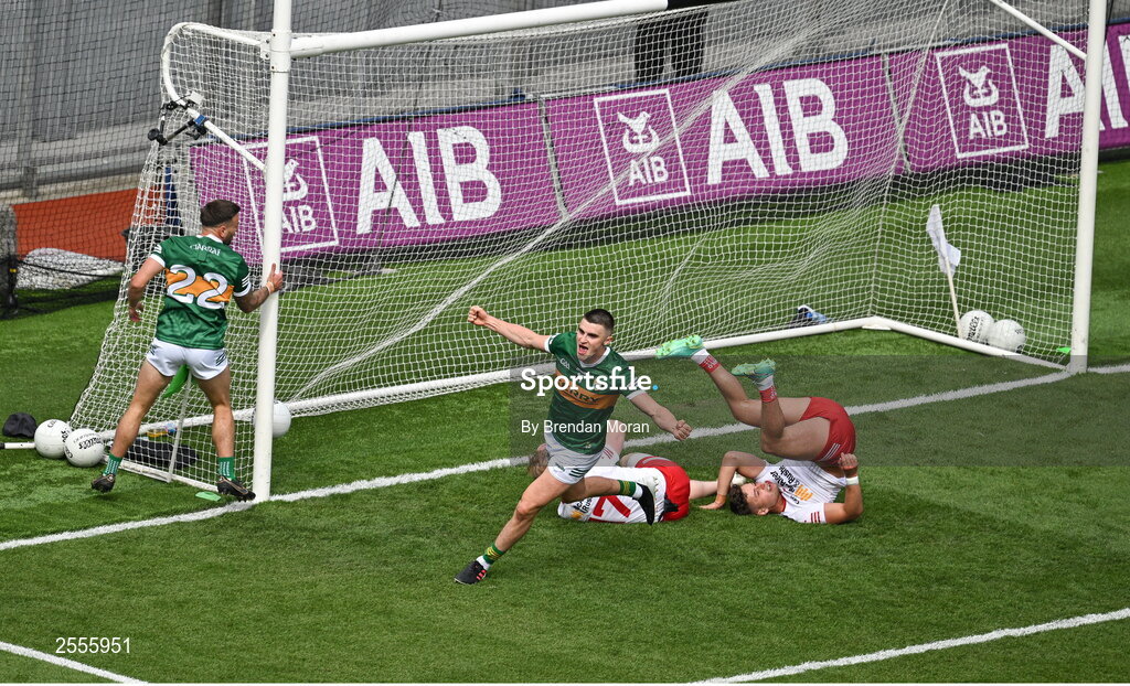 1 July 2023; Sean O'Shea of Kerry celebrates after scoring his side's second goal during the GAA Football All-Ireland Senior Championship quarter-final match between Kerry and Tyrone at Croke Park in Dublin. Photo by Brendan Moran/Sportsfile