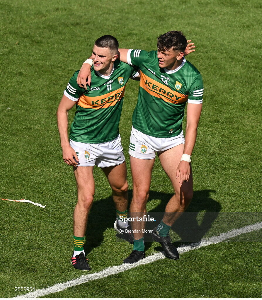 1 July 2023; Sean O'Shea, left, and David Clifford of Kerry celebrate after the GAA Football All-Ireland Senior Championship quarter-final match between Kerry and Tyrone at Croke Park in Dublin. Photo by Brendan Moran/Sportsfile