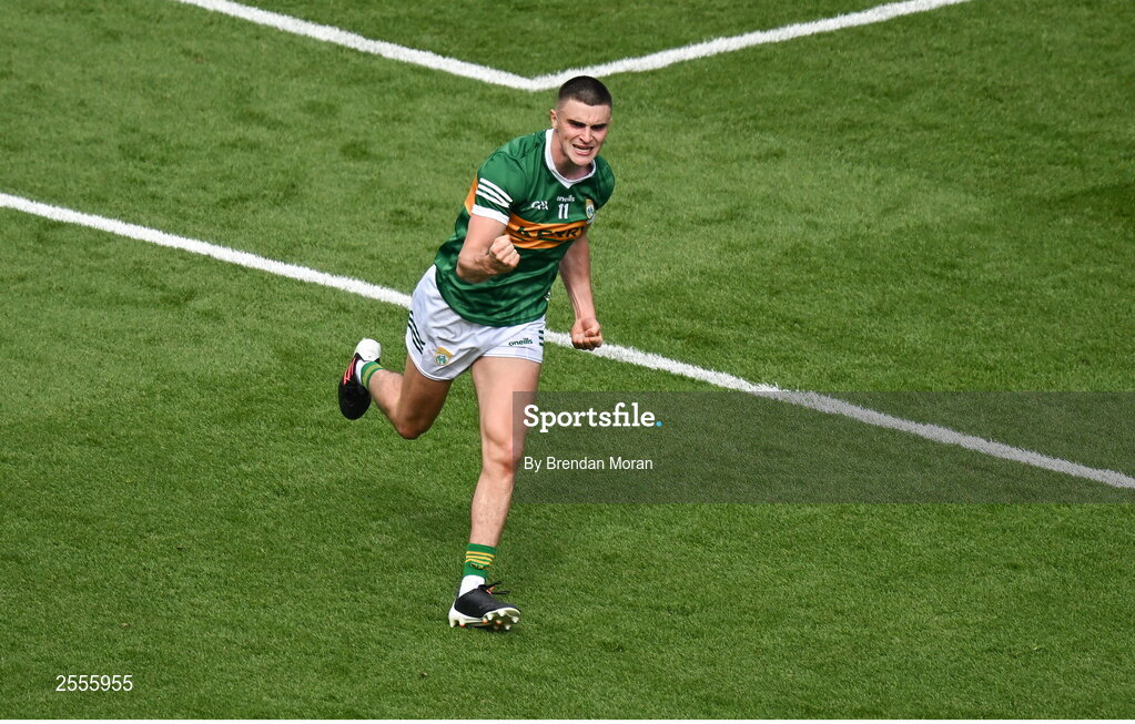 1 July 2023; Sean O'Shea of Kerry celebrates after scoring his side's second goal during the GAA Football All-Ireland Senior Championship quarter-final match between Kerry and Tyrone at Croke Park in Dublin. Photo by Brendan Moran/Sportsfile