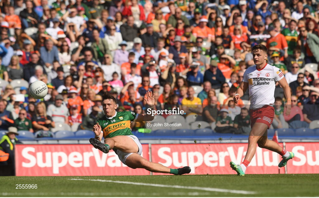 1 July 2023; David Clifford of Kerry shoots as Michael McKernan of Tyrone looks on during the GAA Football All-Ireland Senior Championship quarter-final match between Kerry and Tyrone at Croke Park in Dublin. Photo John Sheridan/Sportsfile
