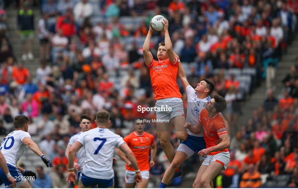 1 July 2023; Rian O'Neill of Armagh wins possession from the throw-in during the GAA Football All-Ireland Senior Championship quarter-final match between Armagh and Monaghan at Croke Park in Dublin. Photo by Ray McManus/Sportsfile
