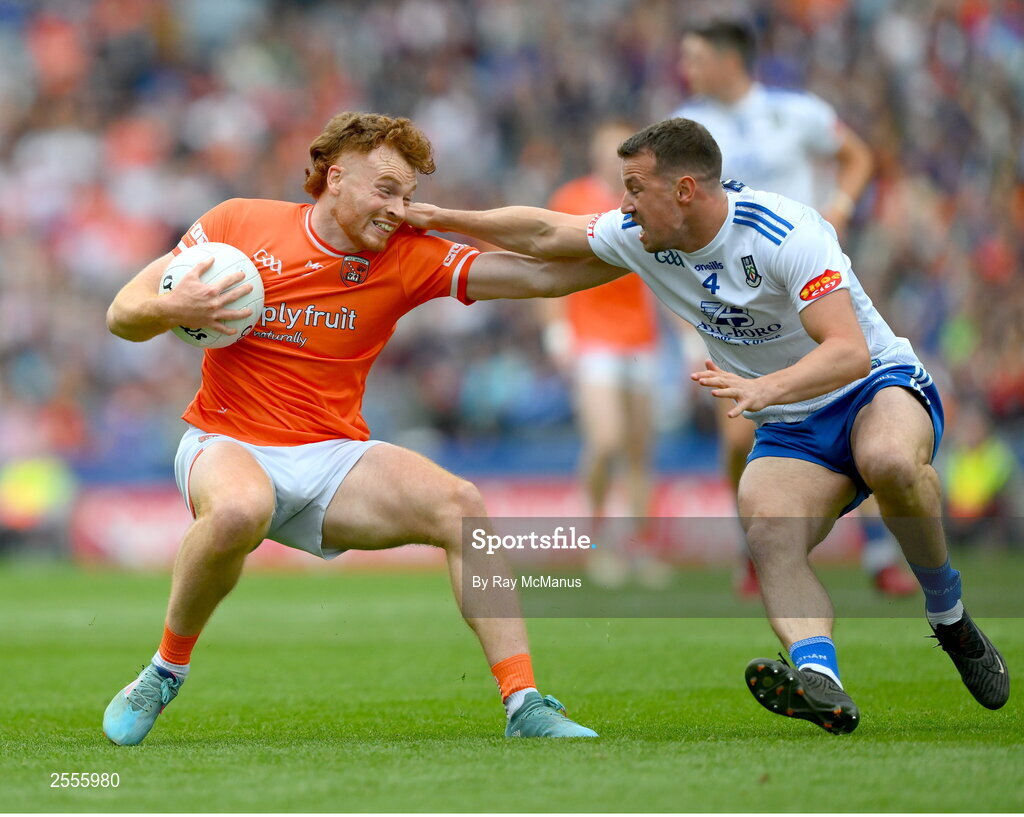 1 July 2023; Jason Duffy of Armagh in action against Ryan Wylie of Monaghan during the GAA Football All-Ireland Senior Championship quarter-final match between Armagh and Monaghan at Croke Park in Dublin. Photo by Ray McManus/Sportsfile