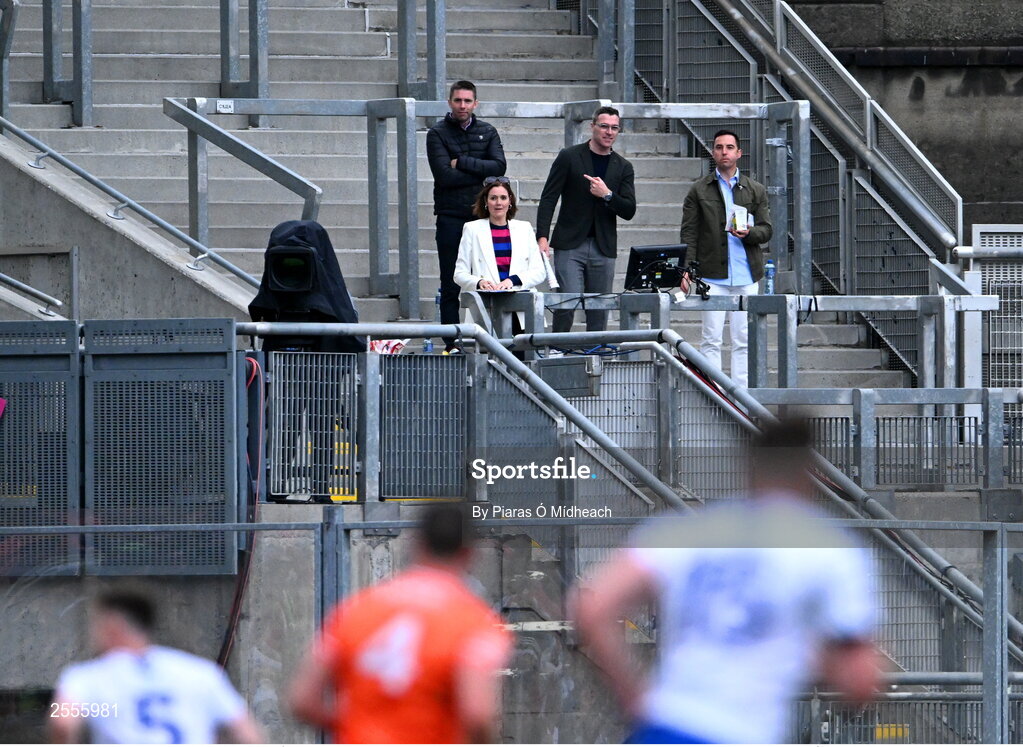 1 July 2023; GAAGO presenter Gráinne McElwain with analysts, from left, Marc Ó Sé, Paddy Andrews and Aaron Kernan during the GAA Football All-Ireland Senior Championship quarter-final match between Armagh and Monaghan at Croke Park in Dublin. Photo by Piaras Ó Mídheach/Sportsfile