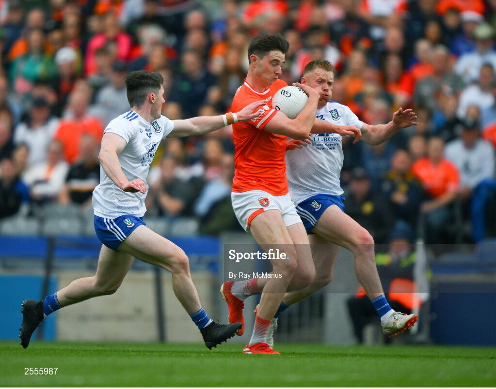 1 July 2023; Ben Crealey of Armagh in action against Ryan McAnespie and Jason Duffy of Armagh, left, during the GAA Football All-Ireland Senior Championship quarter-final match between Armagh and Monaghan at Croke Park in Dublin. Photo by Ray McManus/Sportsfile