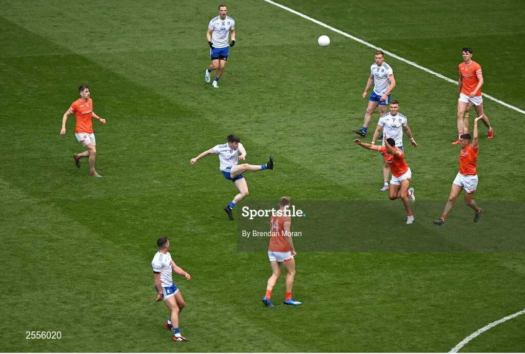 1 July 2023; Stephen O’Hanlon of Monaghan attempts to kick a score over the Armagh defence during the GAA Football All-Ireland Senior Championship quarter-final match between Armagh and Monaghan at Croke Park in Dublin. Photo by Brendan Moran/Sportsfile