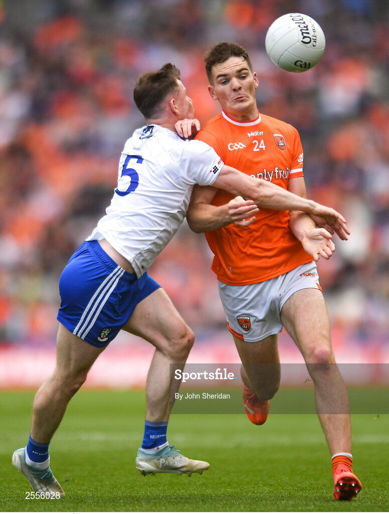 1 July 2023; Jarly Óg Burns of Armagh is tackled by Karl O'Connell of Monaghan during the GAA Football All-Ireland Senior Championship quarter-final match between Armagh and Monaghan at Croke Park in Dublin. Photo by John Sheridan/Sportsfile