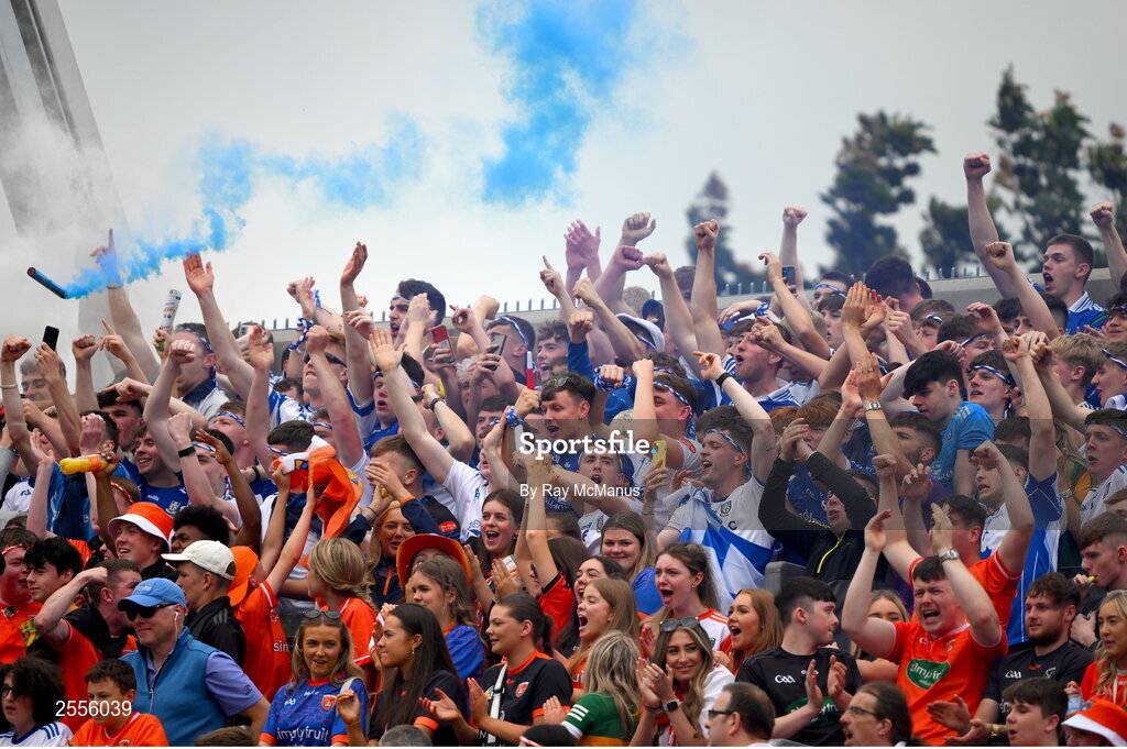 1 July 2023; A 'flare' is thrown by a Monaghan supporter, on Hill 16, before the GAA Football All-Ireland Senior Championship quarter-final match between Armagh and Monaghan at Croke Park in Dublin. Photo by Ray McManus/Sportsfile