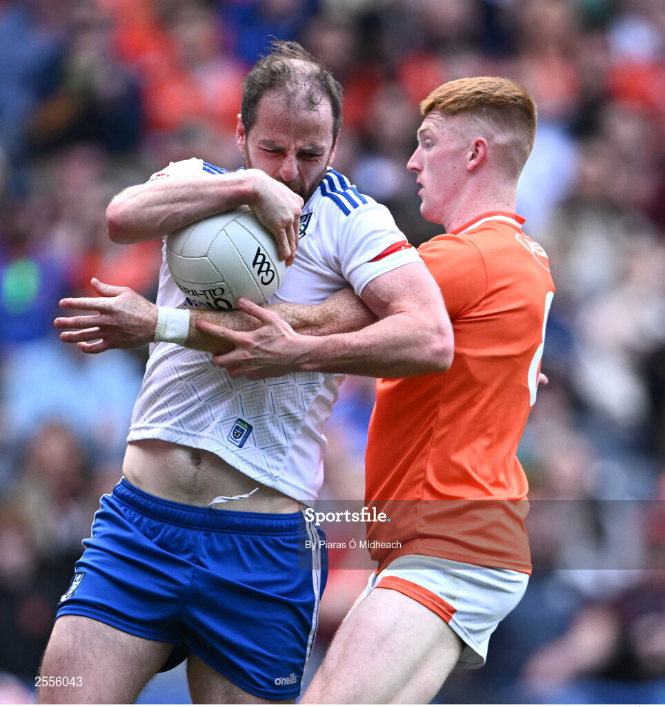 1 July 2023; Conor Boyle of Monaghan in action against Ciaran Mackin of Armagh during the GAA Football All-Ireland Senior Championship quarter-final match between Armagh and Monaghan at Croke Park in Dublin. Photo by Piaras Ó Mídheach/Sportsfile