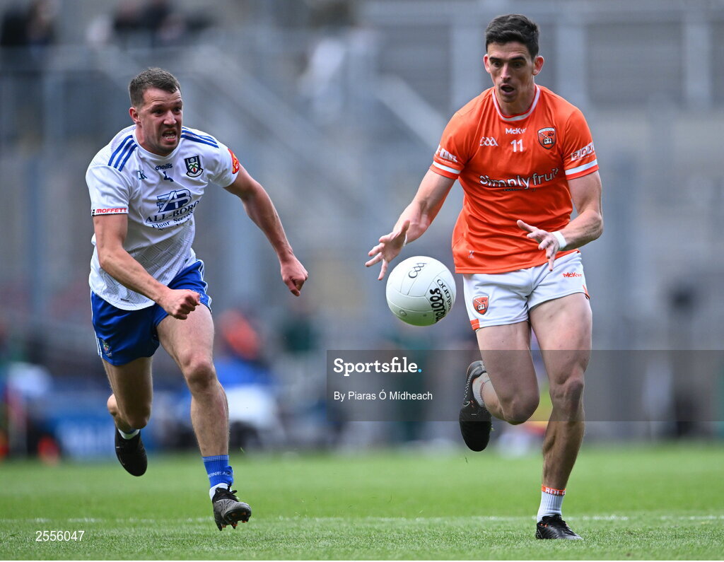 1 July 2023; Rory Grugan of Armagh in action against Ryan Wylie of Monaghan during the GAA Football All-Ireland Senior Championship quarter-final match between Armagh and Monaghan at Croke Park in Dublin. Photo by Piaras Ó Mídheach/Sportsfile
