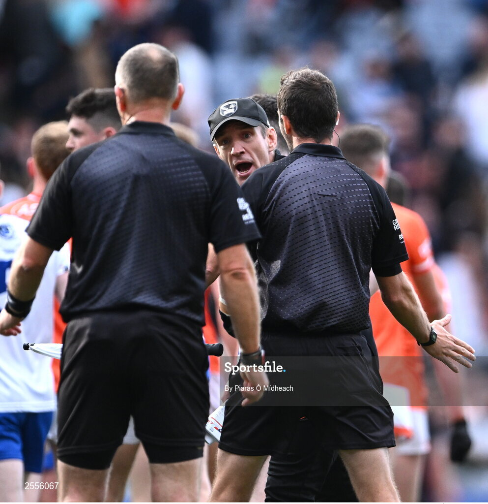1 July 2023; Armagh manager Kieran McGeeney talks to referee Conor Lane at the end of normal time during the GAA Football All-Ireland Senior Championship quarter-final match between Armagh and Monaghan at Croke Park in Dublin. Photo by Piaras Ó Mídheach/Sportsfile