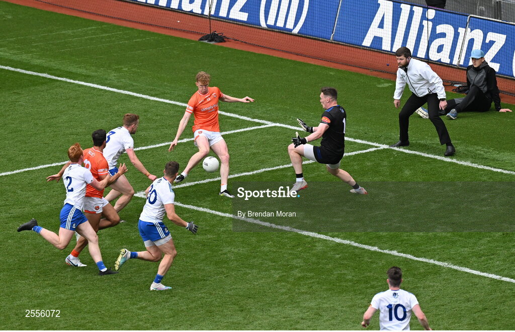 1 July 2023; Conor Turbitt of Armagh has a shot saved by Monaghan goalkeeper Rory Beggan during the GAA Football All-Ireland Senior Championship quarter-final match between Armagh and Monaghan at Croke Park in Dublin. Photo by Brendan Moran/Sportsfile