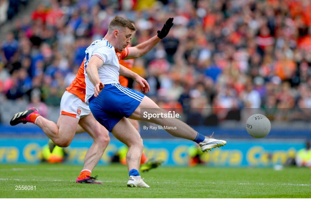 1 July 2023; Michael Bannigan of Monaghan in action against Aidan Forker of Armagh during the GAA Football All-Ireland Senior Championship quarter-final match between Armagh and Monaghan at Croke Park in Dublin. Photo by Ray McManus/Sportsfile