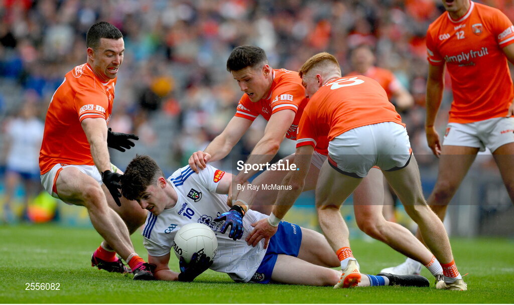 1 July 2023; Stephen O’Hanlon of Monaghan is tackled by Aidan Forker, Ciaran Mackin and Joe McElroy of Armagh during the GAA Football All-Ireland Senior Championship quarter-final match between Armagh and Monaghan at Croke Park in Dublin. Photo by Ray McManus/Sportsfile