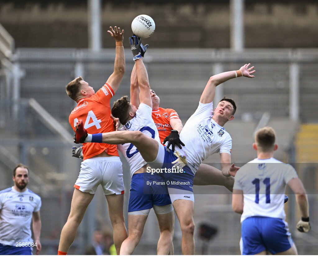 1 July 2023; Armagh players Rian O'Neill, left, and Shane McPartlan in action against Monaghan players Darren Hughes, 20, and Gary Mohan during the GAA Football All-Ireland Senior Championship quarter-final match between Armagh and Monaghan at Croke Park in Dublin. Photo by Piaras Ó Mídheach/Sportsfile