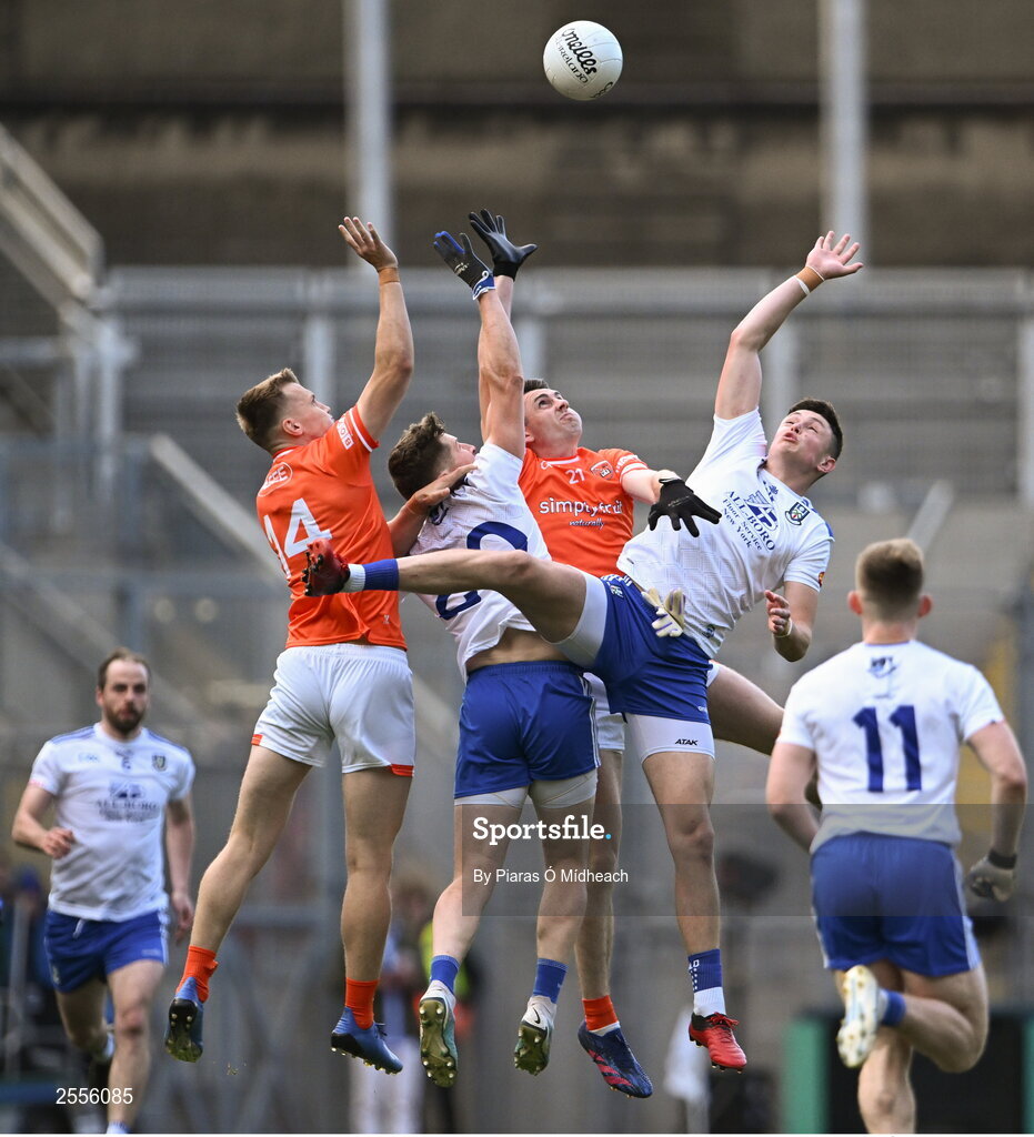 1 July 2023; Armagh players Rian O'Neill, left, and Shane McPartlan in action against Monaghan players Darren Hughes, 20, and Gary Mohan during the GAA Football All-Ireland Senior Championship quarter-final match between Armagh and Monaghan at Croke Park in Dublin. Photo by Piaras Ó Mídheach/Sportsfile