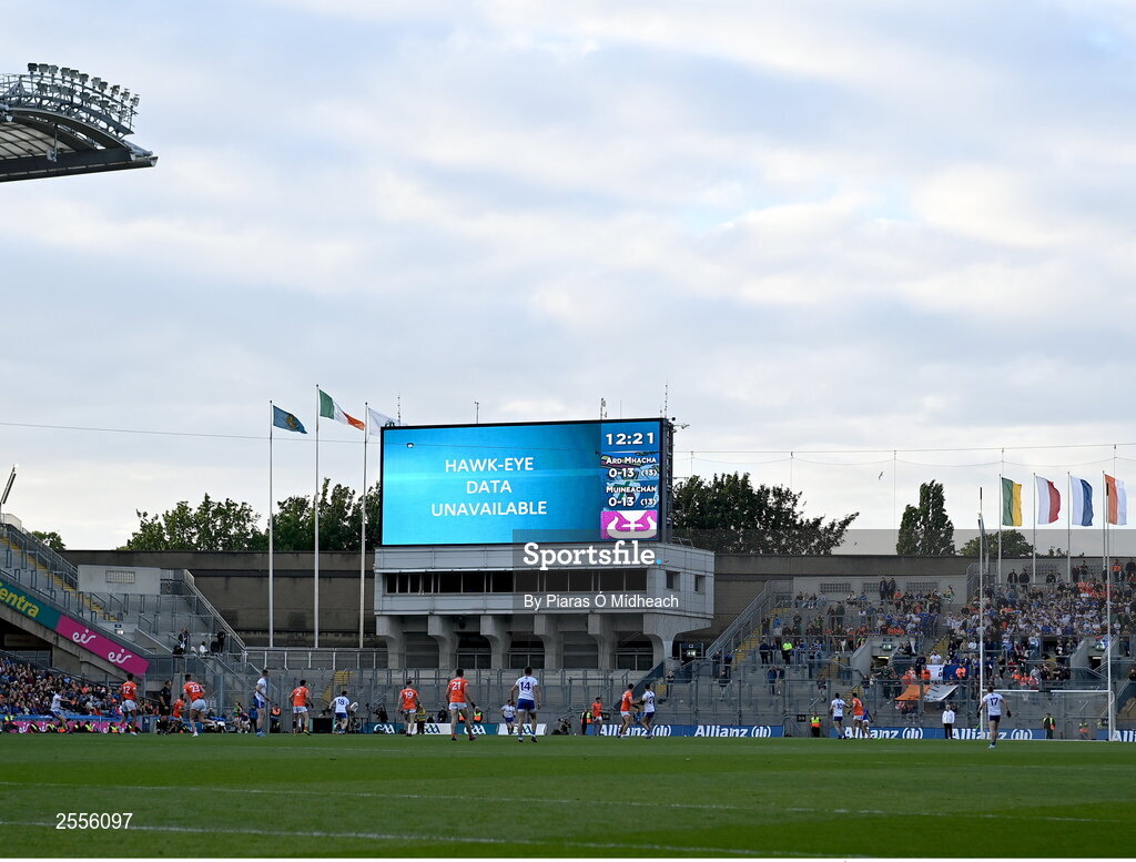 1 July 2023; The Hawk-Eye screen during the second period of extra-time of the GAA Football All-Ireland Senior Championship quarter-final match between Armagh and Monaghan at Croke Park in Dublin. Photo by Piaras Ó Mídheach/Sportsfile