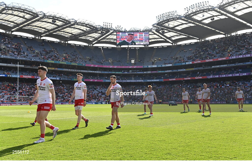 1 July 2023; Tyrone players leave the pitch after their side's defeat in the GAA Football All-Ireland Senior Championship quarter-final match between Kerry and Tyrone at Croke Park in Dublin. Photo by Piaras Ó Mídheach/Sportsfile