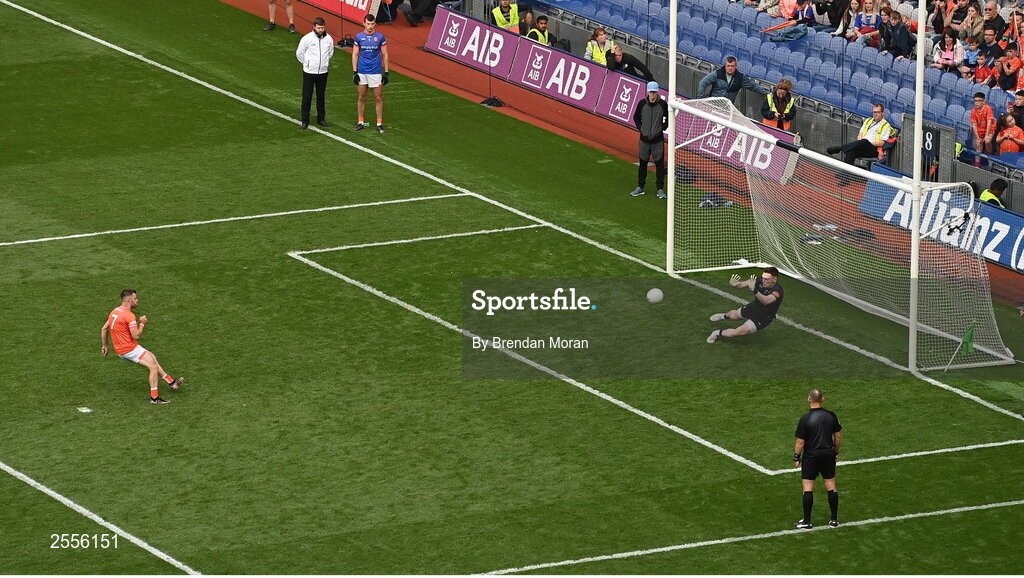1 July 2023; Monaghan goalkeeper Rory Beggan saves a second penalty from Callum Cumiskey of Armagh in the penalty shoot out during the GAA Football All-Ireland Senior Championship quarter-final match between Armagh and Monaghan at Croke Park in Dublin. Photo by Brendan Moran/Sportsfile