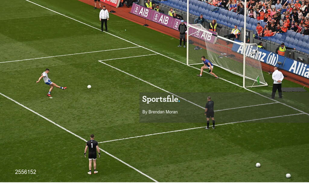 1 July 2023; Gary Mohan of Monaghan scores what proved to be his side's winning penalty past Armagh goalkeeper Ethan Rafferty in the penalty shoot out during the GAA Football All-Ireland Senior Championship quarter-final match between Armagh and Monaghan at Croke Park in Dublin. Photo by Brendan Moran/Sportsfile